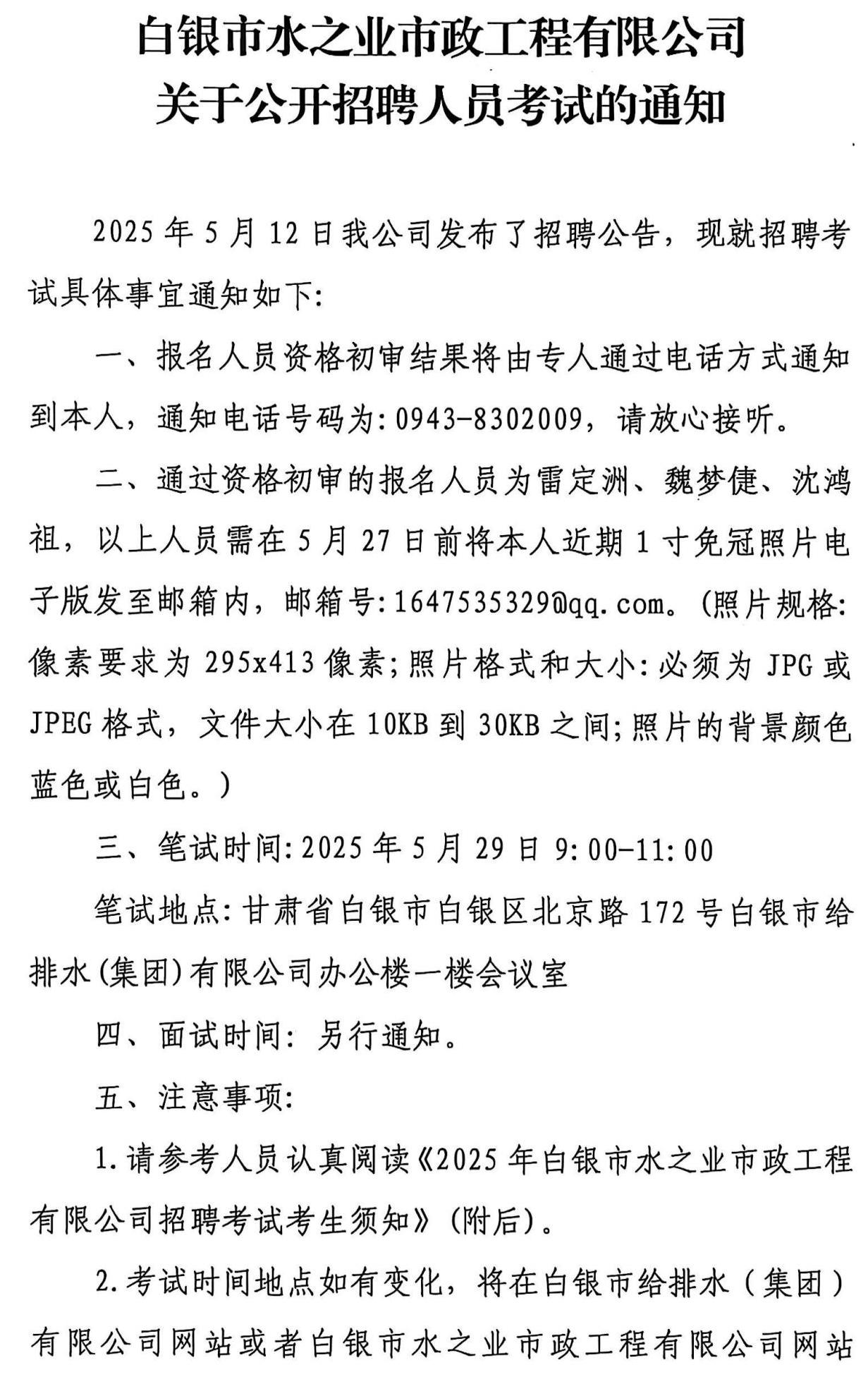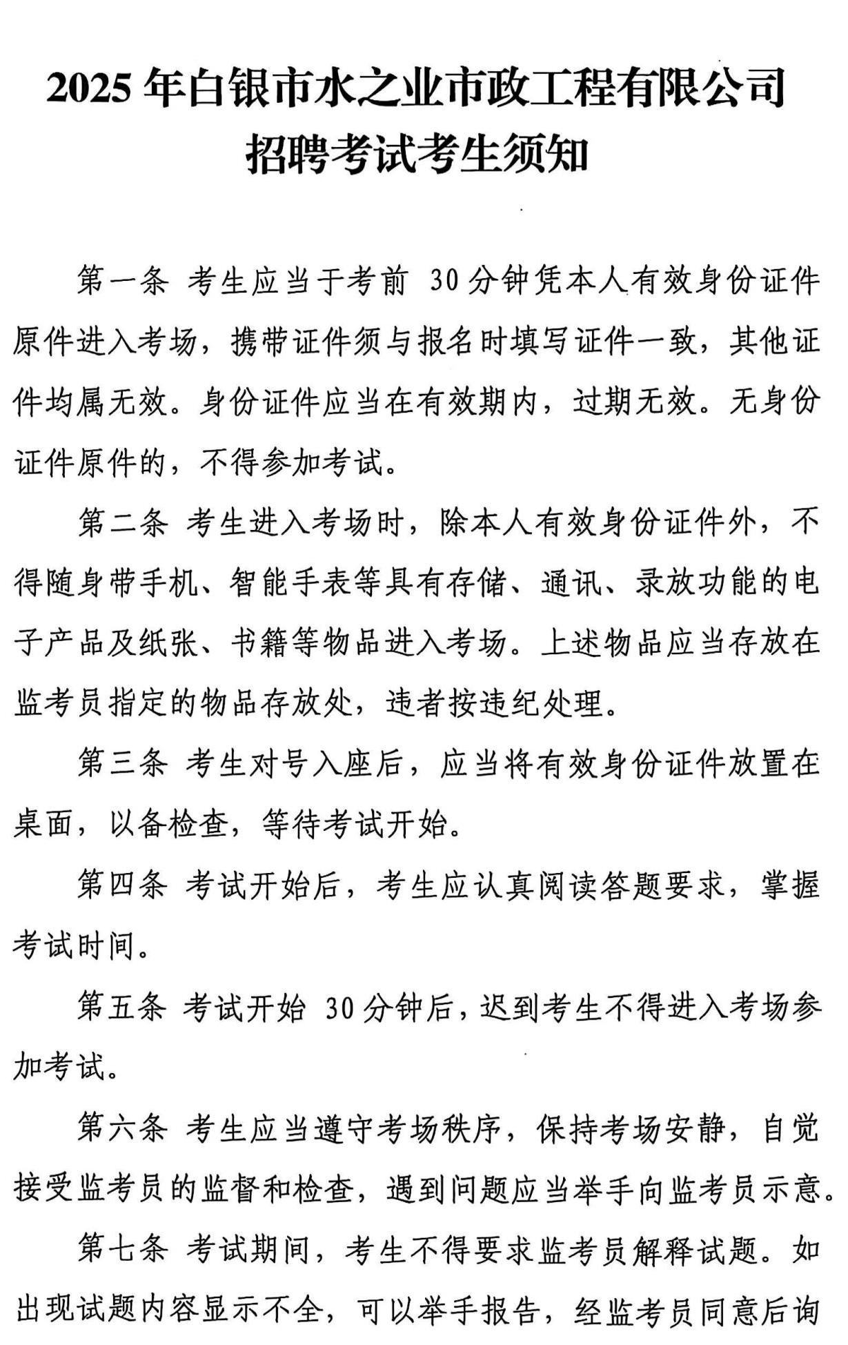 白銀市水之業(yè)市政工程有限公司 關(guān)于公開(kāi)招聘人員考試的通知